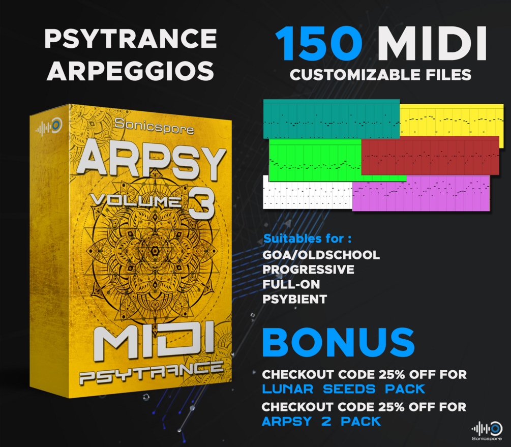 In addition with the purchase of Arpsy3 you will get a bonus of 2 checkout codes of 25% discount to use on the purchase of "Lunar Seeds Psytrance Leads for Serum" and "Arpsy volume 2".